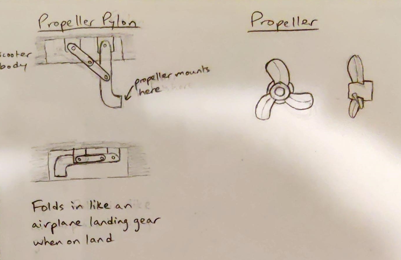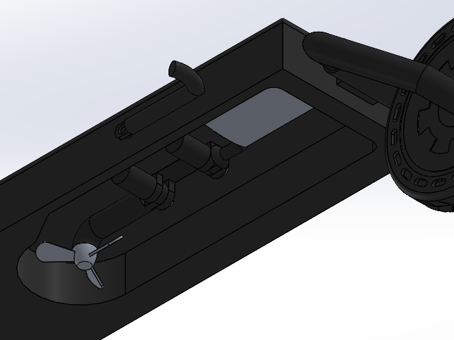 When designing in SolidWorks, I found it challenging to design something that would retract into the scooter body, which wasn't all that large, and especially since I had forgotten to account for the rudder in my initial sketches. It took some trial and error, but I was able to come up with a layout that worked. It's a good thing that we didn't actually have to manufacture this product though; the propeller and rudder don't look big enough to control the scooter.