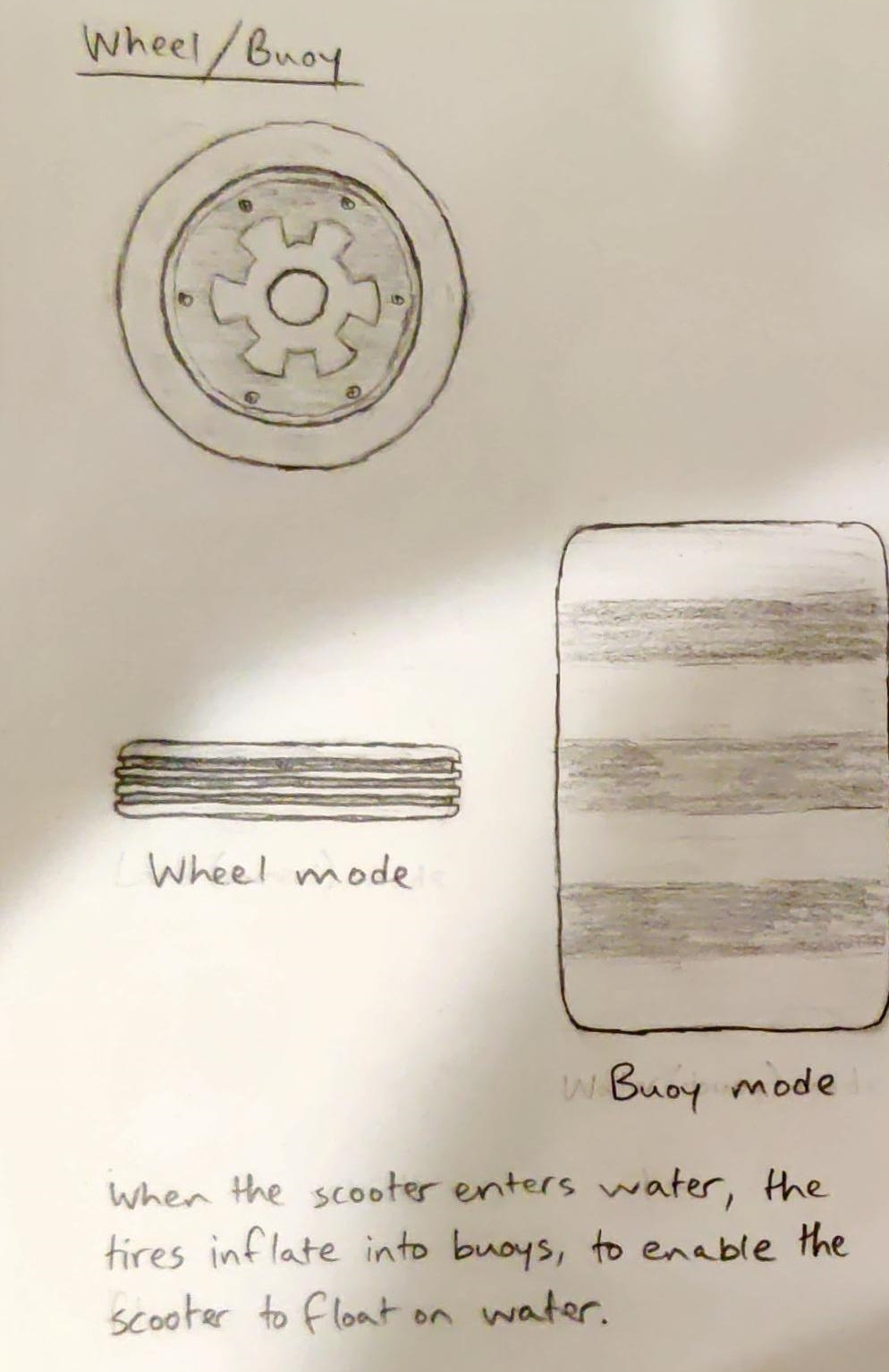 When we were originally conceptualizing this product, we needed to figure out how the scooter would change to move on water. I had an idea where parts of the scooter would be repurposed to work in water, like the tires for instance turning into floatation devices. I sketched this concept, having the tires expand out like an accordion to become buoys, with the folds in the tire in its folded position acting like tire treads.