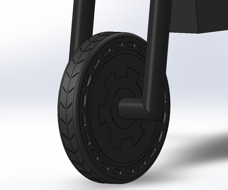 This concept was not very reproducible in SolidWorks, which prefers rigid objects. And so I redesigned the wheels, this time having two rubber halves that split in the middle to reveal an inflatable section. This inflatable part was created with external references, such that it always fills the gap between the two halves of the wheel.
